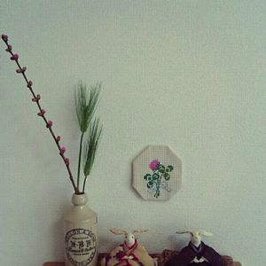 もうすぐ桃の節句です🌸 🏠も古布で作られたウサギのお雛様を出しました✨ 桃の花に菜の花の組み合わせを考えていましたが、麦の穂のグリーンがなんとも優しいのでこちらにしました💖 スーパーのお花ですが(^-^ゞ