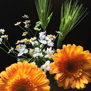今年はじめてお迎えした花は ビタミンカラーのガーベラ マトリカリアとアリウム コワニー、そして花麦を添えると さわやかになりました