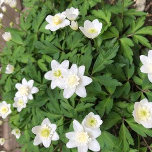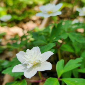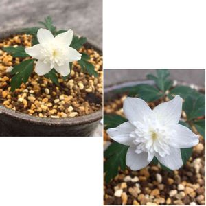 この花は八重咲き一輪草です。 本州から九州にかけて、田畑の土手や野山に群生する一輪草の八重咲きバージョンです。 地面を這って広がり花付もよく、耐寒性もある多年草です。 春に花が咲いた後は地上部が枯れてしまい翌春まで地下茎だけで群生します。 春のごく短い期間だけ華やかに姿を現し直ぐ姿を消してしまうこのような花を妖精に例えスプリングエフェメラル(春の妖精 spring ephemeral )と呼ぶそうです。 日本原産。 キンポウゲ科イチリンソウ属の 耐寒性多年草。