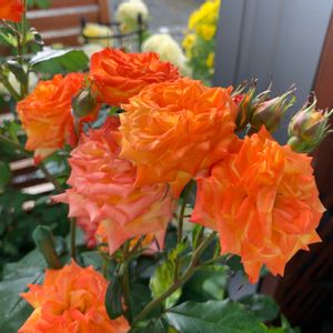 バラのロアルドダールさんが我が家で初開花となりました。赤みのある黄色の中輪咲です。トゲが少なく横張の枝です。