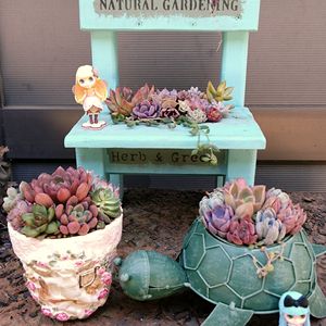 こんにちは(◍•ᴗ•◍) エイプリルフール(ΦωΦ)フフフ… 椅子の寄せ植えも可愛い(^_-)-☆ 昨年インスタでお迎えした中央モスグリーン色椅子をブルー系に塗り塗りしました(^.^; 🐢ちゃんも頑張ってます😉 yubaraさんのエンジェル鉢も チョイ手直ししました(^.^; 今月も宜しくお願いしますm(_ _)m( ꈍᴗꈍ)