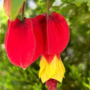 ランプをぶら下げたような可愛らしい赤いぼんぼりを見かけるようになりました💕 友人宅のウキツリボク(浮釣木) 別名チロリアンランプ♪ 赤いガクから黄色い花弁と濃い紫色のしべを出した姿はとってもチャーミング💓