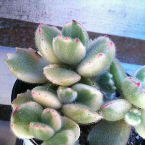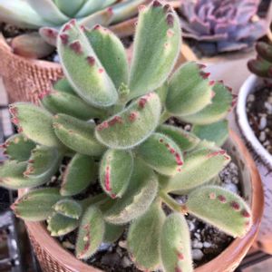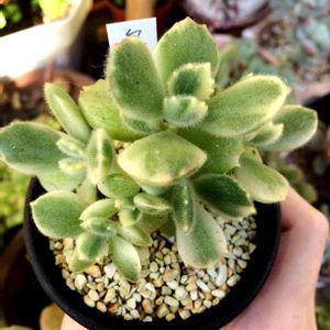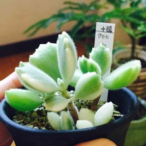 こちらは札が無かったのですが、熊童子の斑入りかなーなんて思っています。 本で見て可愛いと思っていた子。土被ってたし、もうちょっとわさわさしてて欲しかったけど、お安いし出会いが大事!ってことで連れてきちゃいました。 モケモケの子たちってついつい触りたくなる〜