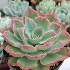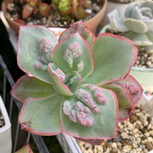 こんばんは😄 昨夜の暴風雨も凄かったですね☔ 我が家の多肉達ヤバいくらい濡れまくってますが元気です😂 ちょこん、右は自分で買った子、左はお友達のJUSHIちゃんに頂いた子💕 両方とも紅葉は醒めてしまったけれど大きくなってきました🙌 ちょこんは初めて育ててるのでまだ我が家の環境でどんな感じに育っていくのか分からないんですが😃 夏越しが難しいと教えてもらいました💦 たぶん片親がカトーさんかグロブローサだろうなと勝手に予想しております🤭 どちらかがもし親だとしても、交配に使うと強いから何とも分からないですが初めての夏越し頑張ってみます😆 夕波、この子もJUSHIちゃんから😊 だいぶ大きくなってきましたよ🙌 もう少しで2号鉢いっぱいの大きさだ😆 ストロベリーミルククラウン、この子は別のタニ友さんから頂いた子🩷 色が凄いでしょ🤣 雨に濡れまくって少しマシになりましたが別の葉挿しっ子はもっと凄くて🤣 この子本当に可愛く育つのだろうか😮💨 ハルビンゲリ、今日写真撮るのに探しまくって何とか見つけました🤣 やらかした時に植え付けた時の大きさ5mmだったんですが、今日久しぶりに見たら1cmあるかないかくらいに成長してくれてました😂 今年はちゃんと育ててあげなければ😰 エケベリアは5mmあれば根っこなくてもちゃんと復活しますから👍 私は何度も経験しておりますのでね🤭 皆様どれだけ小さくても諦めずお水あげ続けてあげてくださいね🤭