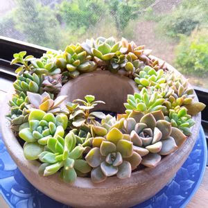 リース鉢の寄せ植えも緑が多くなってきました🌱 スカスカになった所に多肉を足して手直し完成です❣️😊 梅雨入りはまだですが、雨が降ったり止んだり☔🌂 多肉棚に屋根を付けたり外したり💦 毎日の、お天気チェックは欠かせません😩