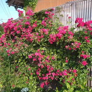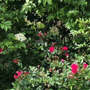 我が家のつるバラ第一号 植え替えても元気で ある時シュートご出てきて こればつるバラというものだと気づいて 訳の分からないまま 枝を倒して固定したら 沢山の花をつけてくれてました とっても丈夫なバラキングローズです🌹😊💕 近くにエルダーフラワーを植えたら とっても大きくなって ちょっと日陰にキングローズがあります 花数が減ってかな😅 明後日までプレ企画してます