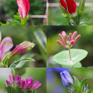 🏷金曜日の蕾たち ↖️ ハイビスカス ↗️ ゴテチャ ⬅️ アルストロメリア ➡️ ツキヌキニンドウ ↙️ スターチス ↘️ アメリカンブルー カーポート下にて 25.05.23