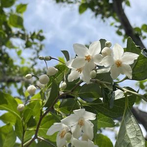 庭のエゴノキ、開花宣言です 見上げると、こちらを見て咲いてくれているよう つぼみと開花が混在する今が、一番好きなタイミングです 新葉が重なる色の具合を葉裏から愛でるのも乙なものです