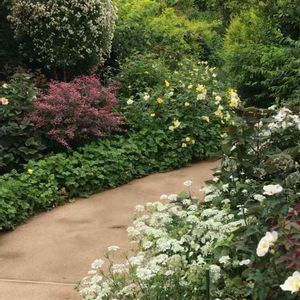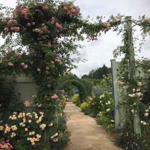 少輪のツル薔薇達をロープに誘引 下の写真のお花達が絡めて有りました🌹 白花、紫、ピンクが連なる風景は素晴らしい(*´꒳`*ノノ゙パチパチ 一季咲きのが多いから期間限定の綺麗さかしら🙌 見られて幸せな気分☘️ 中之条ガーデンズにて