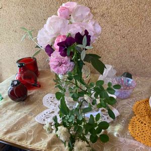 おはようございます😃朝家事も終わり庭パトも終わりました。薔薇も次の子達の為に少しカットしてきて活けました💖 ビオラと相性が良いですね☺️