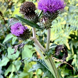 アオモリアザミ(青森薊) 別名 オオノアザミ(大野薊) *キク科アザミ属 花期は8〜9月 北海道南西部.青森県.秋田県など東北北部の平地から山地.亜高山帯までに生育する多年草! 高さは30〜100m! 葉は羽状に切れ込み 根生葉は花期にも残る③ 総苞は鐘形〜広筒状でクモ毛があり総苞片は斜上① 淡紅紫色の頭花を上向きに咲かせる① ノハラアザミと似てますが光沢のある大きな根生葉と分布域が北国限定である事などの違いがあります! 8月15日撮影