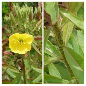 オオマツヨイグサ アカバナ科マツヨイグサ属 海辺や河原などの荒れ地に生えます。 茎には基部が暗赤色に膨れた開出する剛毛が一面にあり、右の写真のように赤点として目立ちます💪
