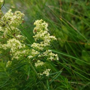 カワラマツバ アカネ科ヤエムグラ属 キバナカワラマツバの白花品種とされ、河原、草地、道端、堤防などに生える在来種です。 ヤエムグラ属では珍しく茎の断面が円形。 葉は線形で光沢があり、先は短い棘状です。本来の葉2個と同形の托葉が輪生状に6〜10個つきます✨ 十字の小花♡やっぱりカワイイ💓