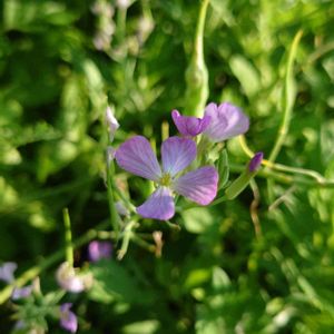 ハマダイコン アブラナ科ダイコン属 日本全国の海や川沿いの砂地に自生する多年草。 先が淡紅紫色、基部が白色の十字形花をつけます。花後は、ぷっくりした豆のような果実ができます。(奥に写り込んでます😊)