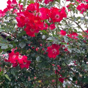 赤い一重の薔薇 カクテル🌹✨ 向かって左側のアーチに仕立てていますが、今年はちょっと横にも流してみました😊 まだまだいっぱ蕾が✨ 全部咲いたらものすごいことになりそ( *´艸`)♥️•*¨*•.¸¸♬︎