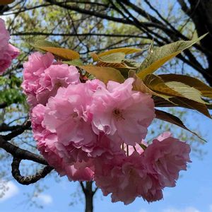 ワンコとお散歩 コロンとまるく咲いた八重桜に 葉っぱが乗っている… 桜餅食べたくなった😆 今日はお花のお手入れと サフィニアの植え付けをしました
