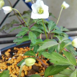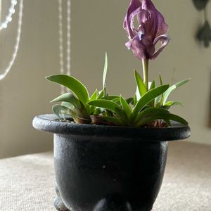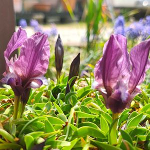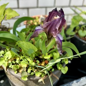 <地道投稿>おはようございます☁️風強い日😨玄関枯れ葉掃き掃除も〰️😓五回以上してます。さつきは二鉢落下しましたが😅割れず済みました😉「姫アヤメ ケイビアヤメ」二鉢日陰で開花中、もう一鉢にも花芽ついてます。客寄せボランティアには二鉢外出順調です✨