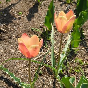 チューリップ🌷 手前のアニカ、葉っぱ開いた‼️ 小型のチューリップやから、こんなんなんか⁉️葉の形がいきなりかわいい‼️ 奥のハッピーアップスター 斑入り葉っぱって事やってんけど、柄ついてるわ。楽しみすぎる‼️ もしかしたら一球でーへんぽいけど、小型のチューリップもすくすく育ってます🌷
