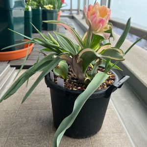 斑入り葉のハッピーアップスター🌷開花です。 もう次はこの子だけ沢山植えたい。 花も淡いピンクで八重咲やしかわいい。 後ろに原種系チューリップアニカがベロンってなってて可愛くない💦 アニカも咲いておくれーー!! ベローーン水枯れかなぁ。