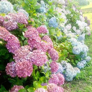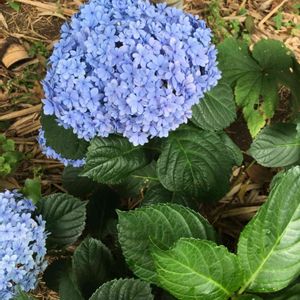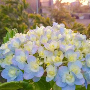 夕陽に照らされる紫陽花てまりてまりです💙 今年も咲いてくれました😆 去年はピンクでしたが、私が青色紫陽花の肥料やったので、青紫って感じかな? 奥に見えるのは、ワッサワサのミモザアカシアテレサです💚 6/25撮影