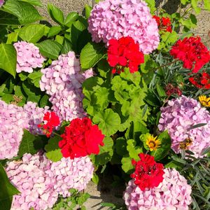 アジサイとゼラニウム。 よーく見るとガザニアも隠れんぼ。