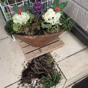 😱①ジュリアン撮影に外に出た😭 ②犯人😼😽👈😡👉後方は逆ギレ😾😿前方は知らん顔 こうなるから、いつもは😺に届かない所に置くのだけど、今日は孫達が来てて、移動を忘れた😅💦 ワイヤーネットで全て囲ってるのは猫避けです😅 ③元に戻したけど、大丈夫かなぁ😰