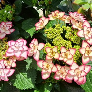 アジサイひなまつり 咲き進んでいます💞額咲きアップ みなさまここでクエスチョン Q.~庭に植えたらじわじわ赤系から青系に変わってきました 土壌は酸性かアルカリ性かどちらが強いでしょうか❓️😸ワカルカニャ