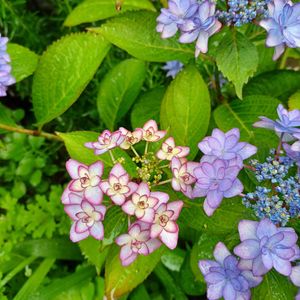 おはようございます✋😊☁ 紫陽花のひな祭りサンは花びらの縁取りが素敵です💞 葉っぱ🌱にも黒い縁取りがあり、お花が無い時も葉っぱ🌱だけでも素敵です💞 お花が不揃いですが、2年目も咲いてくれて嬉しいです🤗💓 「🏷紫陽花祭り」に参加させて下さいね🙏