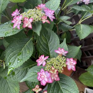 母の日の紫陽花ひなまつり🩷🩵💛 緑色になり、7月早くに剪定しました。 新しい芽が元気よく出ています。 少し大きい鉢への植え替えは、 11月?だったかな?今はしない方がいいんですよね? 切った花はそのままドライになりました。