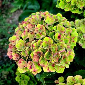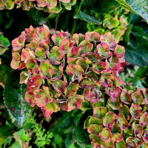 晩秋まで色が変化する西洋あじさい。 ピンク→赤ピンク→黄緑→現在
