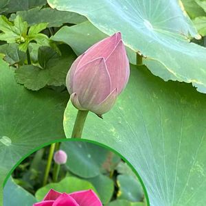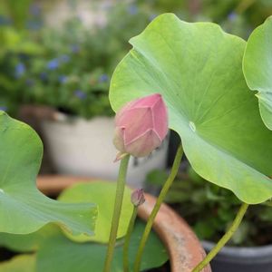 🪷茶碗蓮のお華 「ハス」の園芸品種の中でも小型の品種の総称です。 葉の高さも約70cm位。 いくつもの系統があり、鉢栽培に用いられます。 7月から9月頃淡紅色〜白色の花を咲かせます。 名前は、茶碗のなかでも育てられると言うことから。 ハス科ハス属の水性多年草 学名 Nulumbo nuciferacx. 英名 Dwarf sacred water lotus. ✧今年の3月13日に鉢に1/3位の土(田んぼの土見たいの)を入れ 茶碗蓮の根を植え水耕栽培にし、ベランダで育てています。 初めに出ていた茶碗蓮の葉っぱ・直径5cmのが10枚位は、枯れた葉っぱとなり、水の中の黒くフニャフニャの腐った茎も一緒に捨てました。 …すべて枯れてしまうかと心配しましたが、茶碗蓮の鉢の水を2日に1回変えたり、鉢がなるべく日当たる方に移動したりしました。 その後6月から、直ぐ大きな葉っぱが次々に出て来ました。大きな葉っぱが8枚くらい出揃い…ついに今朝〜花芽が1つやっと立ち上がってくれました𓂃 𓈒 𓂂𓏸𓏸ꕤ*.゚ 🪷次回は、この茶碗蓮がパカッと咲きしだいpicしますネ〜♡