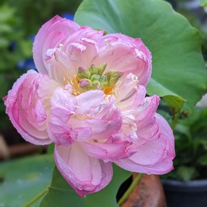 🪷茶碗蓮・小舞妃 (爪紅・一重咲き) 黄花蓮の血が入っており、花弁元がわずかに黄色みを帯びる。非常に花上がりが良く強健。 英名 Little Dancing Princess (リトル・ダンシング・プリンセス) 🪷茶碗蓮のお華 「ハス」の園芸品種の中でも小型の品種の総称です。 葉の高さも約70cm位。 いくつもの系統があり、鉢栽培に用いられます。 7月から9月頃淡紅色〜白色の花を咲かせます。 名前は、茶碗のなかでも育てられると言うことから。 ハス科ハス属の水性多年草 学名 Nulumbo nuciferacx. 英名 Dwarf sacred water lotus. ✼••┈┈┈┈┈┈┈••✼ おはようございます🌤 少し甘い香りの素敵なお花が咲きました𓂃 𓈒𓏸🪷 「1番花2日目」 〜今年の3月13日に鉢に1/3位の土(田んぼの土見たいの)を入れ 茶碗蓮の根を植え水耕栽培にし、ベランダで育てています。 初めに出ていた茶碗蓮の葉っぱ・直径5cmのが10枚位は、枯れた葉っぱとなり、水の中の黒くフニャフニャの腐った茎も一緒に捨てました。 …すべて枯れてしまうかと心配しましたが、茶碗蓮の鉢の水を2日に1回変えたり、鉢がなるべく日当たる方に移動したりしました。 その後6月から、直ぐ大きな葉っぱが次々に出て来ました。大きな葉っぱが8枚くらい出揃い…花芽が1つやっと立ち上がってから約三週間かかり、ついに昨日、開いてくれました𓂃 𓈒 𓂂𓏸𓏸ꕤ*.゚今日は2日目・もう1日もつよ〜♪と言われていましたが… 🌀強風が吹きさらし…午後には、花びらが散ってしまいました…💧