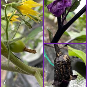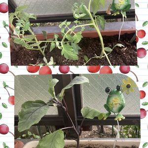 ナス🍆 プランター空き待ちで出遅れた左は千両二号🍆、右2個は水ナス🍆 今年は収量がとても少なく、千両二号🍆はまだ3個目、水ナス🍆は17個目😅 今年の天候、ポットからプランターへ移す時期、使い回しの土などが原因か?