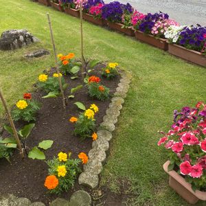 種まきした ナスとマリーゴールドの株 花壇に植えてみました^^* この花壇に野菜を植えるのは初めてで、 はたして育つかどうか。