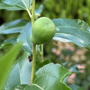 孫の記念樹として植えたジャンボナツメ。初めて実がつきました❣️ お兄ちゃんの方のブルーベリー🫐もたくさん実っています♪ 今年は、花ばかりでなく、実もの、野菜なども育て始めました。 みのると嬉しい😆