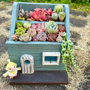 明日は雨☔が降るみたいです。 先日、初めて豊橋の「ガーデン ガーデン」さんに行ってきました😃 お店の広さにびっくり😳💦しました! wood boxさんの作品、はるさんの箱庭、本当に素敵でした✨ picは沢山ある作品の中から、迷いに迷い私がチョイスしたプランターです💕 こんな感じの箱庭にしてみました! 自分へのご褒美として、少しずつ集めさせてもらいたいと思っています☺️💕