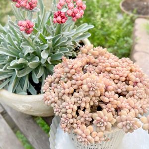 おはよーございます ฅ՞•ﻌ•՞ฅ 春先から雨ざらしにした姫秀麗が ぷくぷくに膨らみ いちごミルクのようなピンクになりました🥰 ヘリクリサム ルビークラスターのつぼみもまんまるつぶつぶでかわいい〜💕 開花も楽しみです(ღˇᴗˇ)。o♡ イチゴはないけど イチゴっぽいpicということで… 🏷毎月15日はいちごの日に参加します🍓