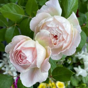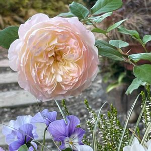 今朝の🌹、マリーヌ。 淡い色のビオラの寄せ植えと いっしょに💕 優しさに溢れてます(o^^o)