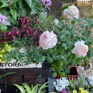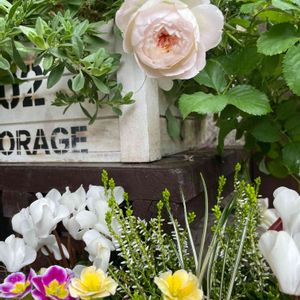 軒下のお花達。 🌹マリーヌを迎えてから、 とても優しい雰囲気になりました。 これから作りたいリースや、 寄せ植えも、淡いお花を選んでます。
