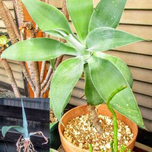 我が家にかわいいアガベが来たつながりで、、(前のpic) かわいくない姿でやって来た アガベ、アテナータです あるホムセンのグリーンコーナーの端の端の端〜に赤札がついて置いてあったアテナータ(左下のでした) こんな姿で〜😱気の毒に〜 うちのシンボルツリーにしてやっか(ベランダの💦) と連れてきて3年くらい👍 元気にしてんな〜 ちと傾いてるけど💦 そして気づく シンボルツリーなんか 置けるほどの ベランダじゃない ってことを、、😅