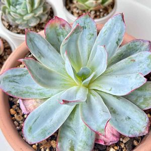 ブルーライト。 ピンク色のエッジが眩しい感じ✨ 面白い柄も入ってます(笑) 薄葉の多肉ちゃんって 綺麗だなぁ🎵