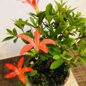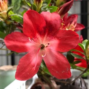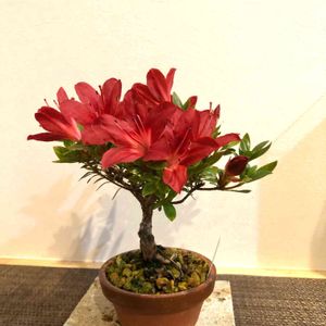 さつき(黒紅の月) 咲き始めました🌺 今年は花芽が少ないかな〜 全体的に真っ赤に咲かせたいけど 小品盆栽は難しい😥