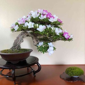 サツキ『愛の月』と『スナゴケ』 今回は根上り樹形です。 この品種は、純白無地花をベースに、濃紫色の小絞りや飛び入り絞り、覆輪、底白、紫色無地と花柄も豊かです。 この樹の見所は、古相を帯びた幹味だと思いますので、ぜひ拡大してご覧ください😅