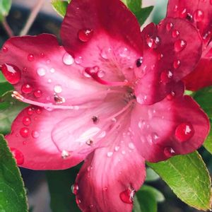 サツキ『天翠(てんすい)』 花芸の豊富な品種です。 白地に濃紅色と濃紫色の大小絞り、薄い紫色とトキ色の大小絞り、覆輪、底白と、白色、濃紫色、濃紅色、うすい紫色、トキ色の無地花が咲きます。