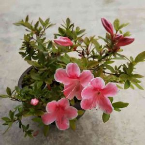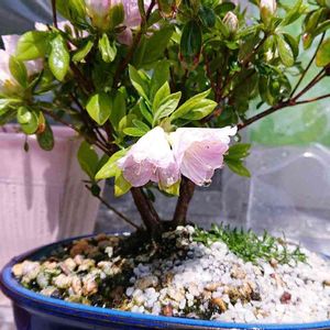 サツキ盆栽 柔らかな色彩の花を咲かせる 「山の光」です。