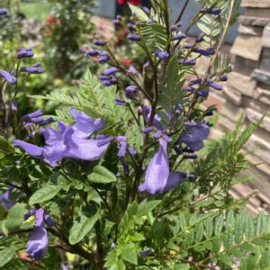 ジャカランダ 今年も咲きました💙去年より大きくなったけれど1メートル位で鉢植えで扱いやすいです♪冬外に出しっぱなしだったので枯れてなくてよかった😊