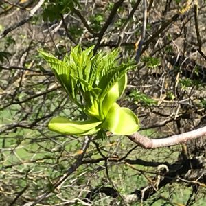 Coyote valleyにて。いろいろな木が芽吹いてきました。この芽はみずみずしい緑て、スマホのカメラで伝えきれないのが残念。調べたところ、California buckeye の若芽でした。 学名 Aesculus californica