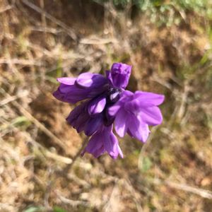 Almaden parkにて。30センチほど伸びた細い茎の先に小さな紫の花がまとまって咲いているのを発見。そよ風に揺れていました。 当地原産の Ookowという花でした。 3週間前にはなかった青や、紫の花も目につき始めました。 学名 Dichelostemma congestum ブローディア亜科に入るそうです