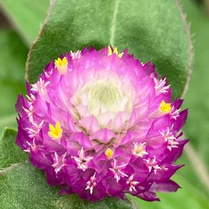 センニチコウ(千日紅) ヒユ科センニチコウ属 ピンクの花に見える部分は苞で、黄色や白い小さな部分が花と知った去年。