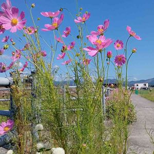 毎月11日は🏷️ソラの日🏷️🔎👀🔍 水路沿いの花道白いセンニチコウとピンクのコスモス秋空と共にお届けします。🤗 昨日から海は台風の影響で波高し。😈👻😇